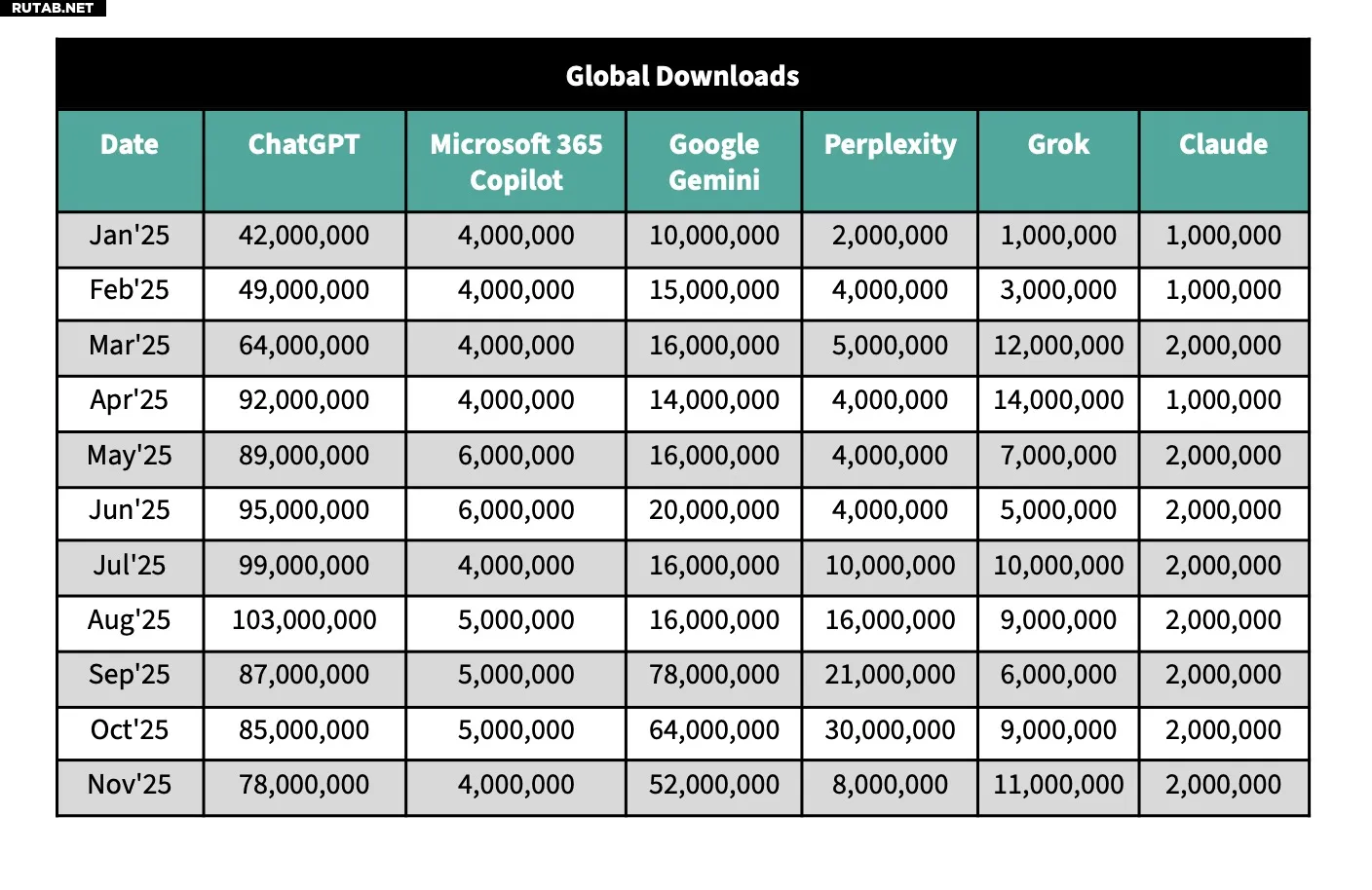 Глобальные загрузки ChatGPT к ноябрю выросли на 85% в годовом исчислении, но это отставание от среднего роста по всей группе в 110%.