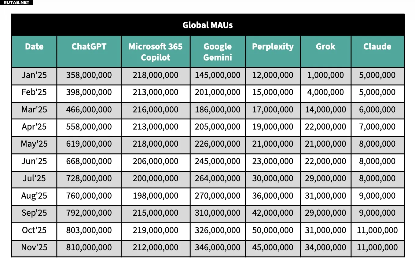 К ноябрю 2025 года количество глобальных месячных активных пользователей ChatGPT выросло на 180% в годовом исчислении, в то время как у Gemini этот показатель увеличился на 170%.