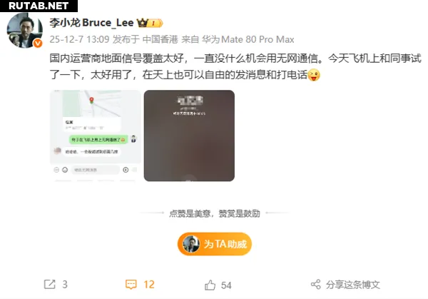 «Сегодня в самолёте с коллегой попробовали связь без сети — работает отлично. Даже в небе можно свободно отправлять сообщения и звонить», — написал Ли Сяолун.