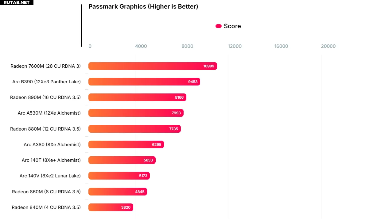 Важно отметить, что данные тестов PassMark, по всей видимости, недооценивают возможности архитектуры Xe2. В реальных играх производительность Arc 140V часто оказывается сопоставимой с Radeon 890M. Это говорит о том, что тестовое окружение PassMark может быть неоптимальным для старых версий графики Intel, тогда как новая архитектура Xe3 в нём показывает себя лучше.