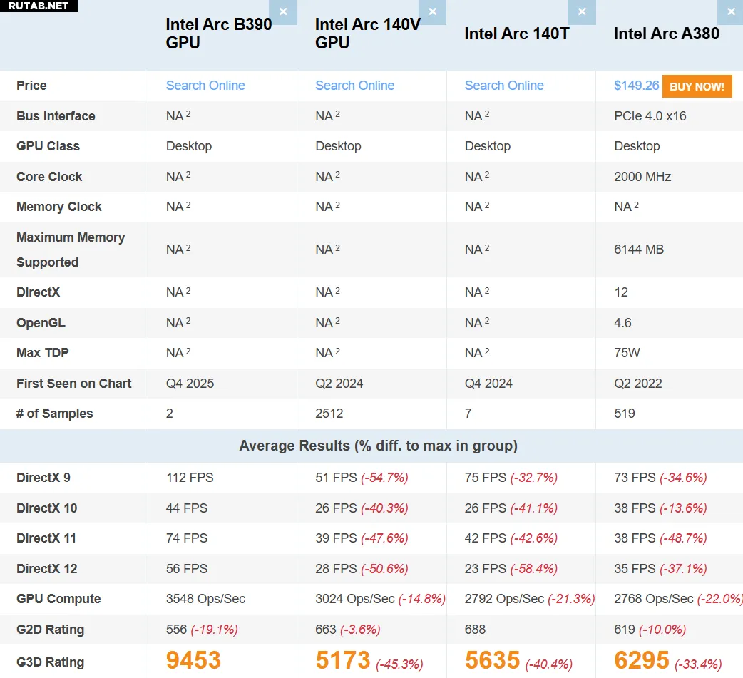 По сравнению с предыдущим поколением Arc 140V (8 ядер Xe2) это означает рост производительности на 83%. Производительность также на 67% выше, чем у Arc 140T (8 ядер Xe+). Более того, B390 опережает даже дискретную видеокарту начального уровня Arc A380 на 50%.