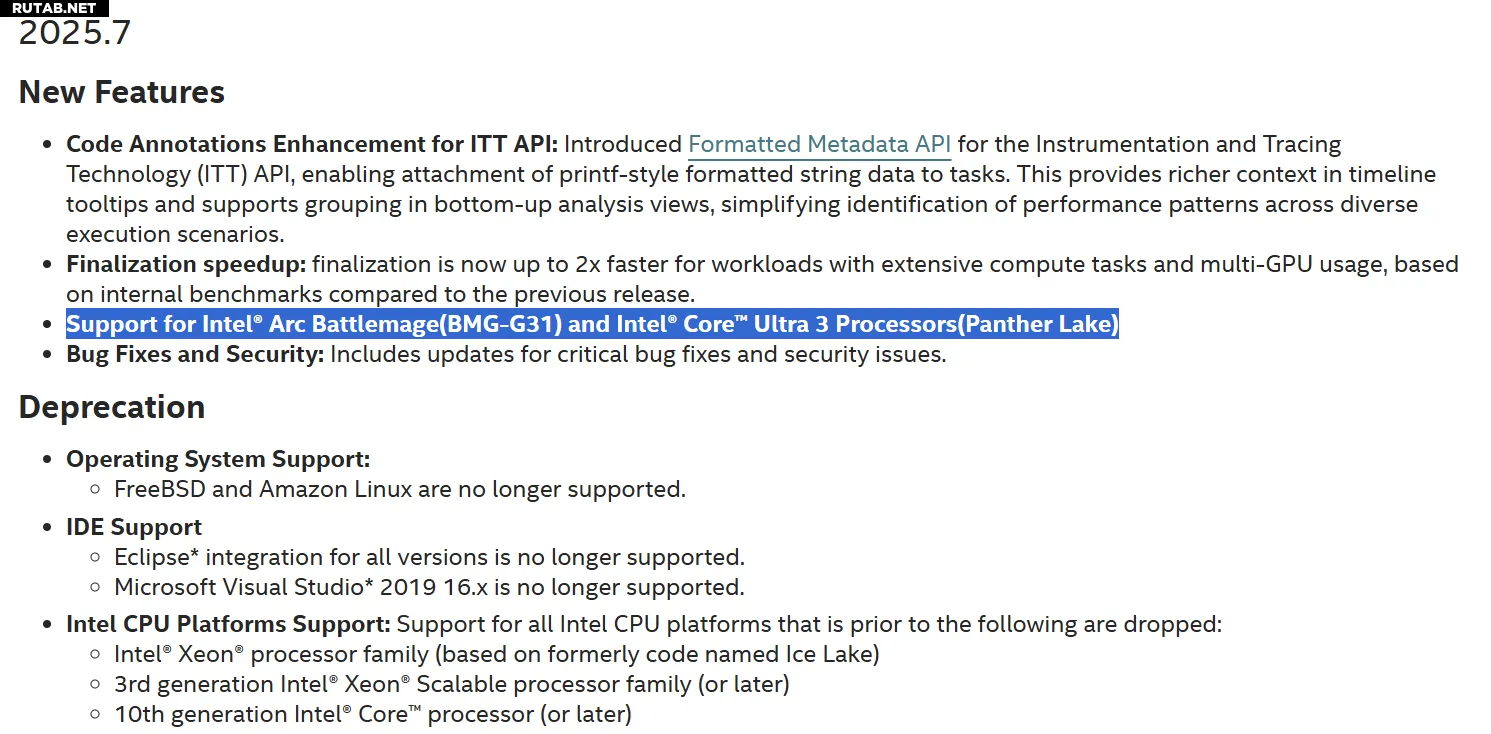 Название этого графического процессора появилось в списке изменений для инструмента анализа производительности Intel VTune Profiler. В обновлении прямо указано, что добавлена поддержка двух ключевых аппаратных компонентов: процессора Intel Core Ultra 300-й серии (кодовое имя Panther Lake) и дискретной графики Intel Arc Battlemage (BMG-G31).