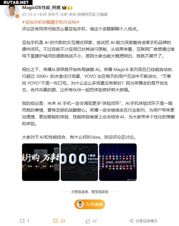 Комментируя этот проект, инженер по оптимизации производительности компании Honor, известный под ником «MagicOS性能_阿勇», заявил, что «смартфон Doubao — это исследование новых способов взаимодействия в эпоху ИИ, попытка глубоко интегрировать возможности искусственного интеллекта в аппаратную экосистему конкретного бренда».