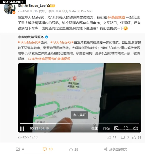 Он сообщил, что благодаря мощной технологии позиционирования внутри туннелей в сериях Huawei Mate 80 и Mate X7, компания совместно с картографическим сервисом Amap реализовала точную навигацию по кольцевой дороге в районе памятника Освобождению в Чунцине.