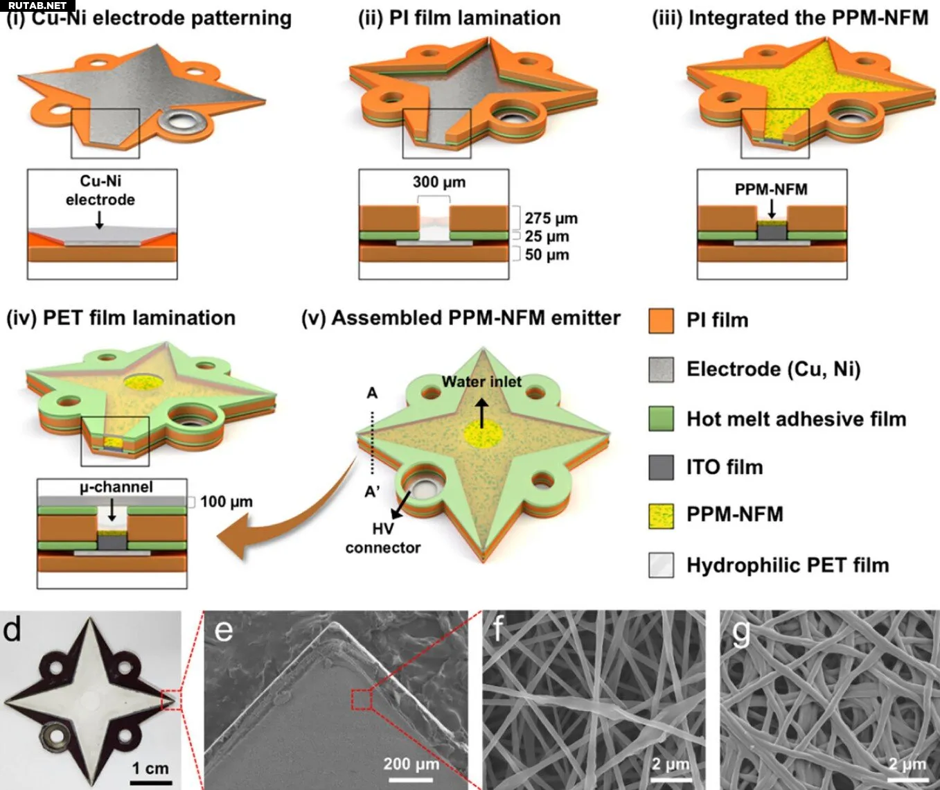 Внутри устройства находятся высоковольтный электрод, нановолоконный абсорбер, который самостоятельно впитывает воду, и полимерные микроканалы для её транспортировки. Такая конструкция обеспечивает стабильную работу без использования насоса.