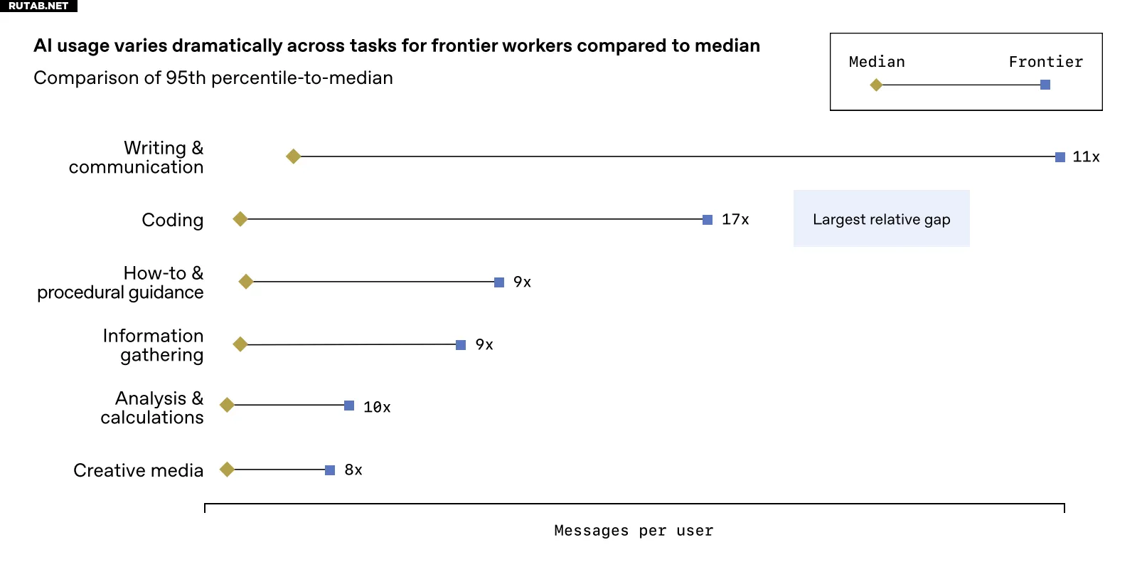 В отчёте также отмечается «растущий разрыв во внедрении ИИ» между передовыми работниками, которые экономят больше времени, и отстающими. Руководство OpenAI видит в этом возможность для отстающих наверстать упущенное, хотя для некоторых работников такое «догоняние» может означать автоматизацию их функций.