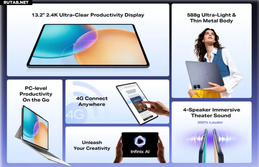 Аудиосистема представлена конфигурацией из четырех динамиков. По заявлению Infinix, они обеспечивают «иммерсивный театральный звук» с громкостью на 300% выше, чем у стандартных решений. Для подключения к сети планшет поддерживает 4G LTE и Wi-Fi. Дизайн модели выполнен в тонком металлическом корпусе весом 588 граммов, который производитель называет ультралегким. В Малайзии устройство доступно только в цвете Celestial Ink Gray.