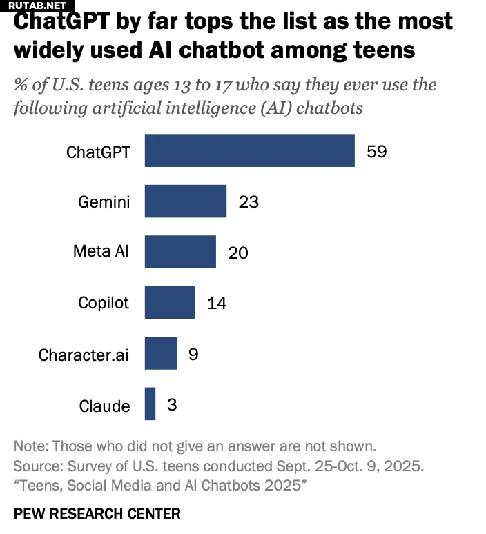 Самым популярным чат-ботом оказался ChatGPT, которым пользуются 59% опрошенных подростков. Google Gemini используют 23%, а Meta AI — 20%. В целом, 46% подростков обращаются к ИИ-чатам несколько раз в неделю или чаще, а 36% не пользуются ими вовсе.