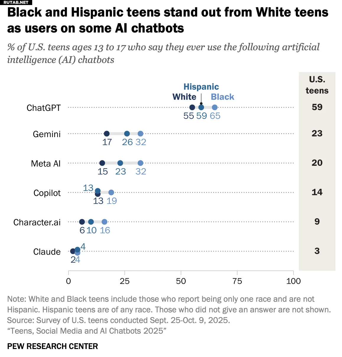 Исследование выявило различия в использовании технологий в зависимости от расы, возраста и дохода. Например, чат-ботами пользуются 68% чернокожих и латиноамериканских подростков по сравнению с 58% белых. Также чернокожие подростки примерно в два раза чаще используют Gemini и Meta AI.