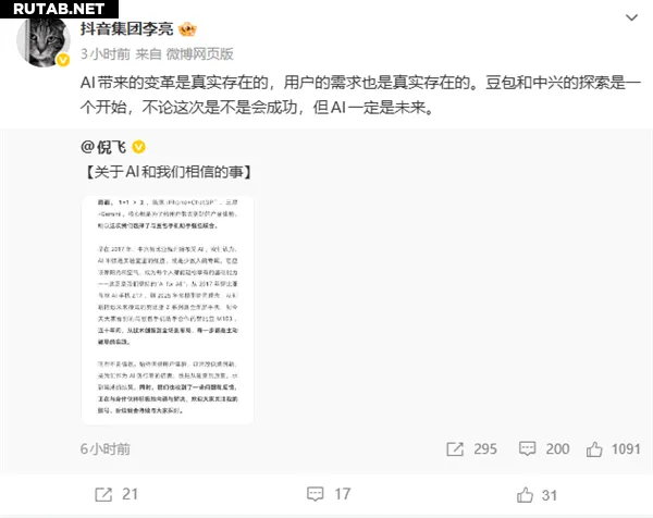 Вице-президент Douyin (китайская версия TikTok) Ли Лян сегодня высказался по этому поводу. Он заявил: «Преобразования, которые приносит ИИ, реальны, как и реальны потребности пользователей».
