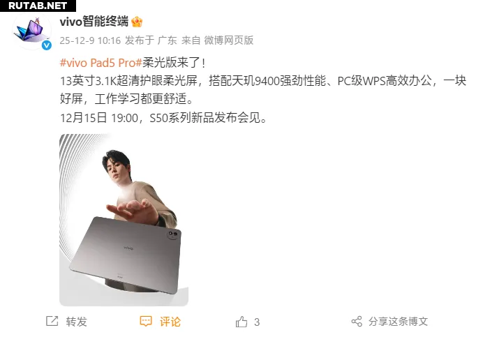 Vivo представит планшет Pad5 Pro с антибликовым экраном 15 декабря