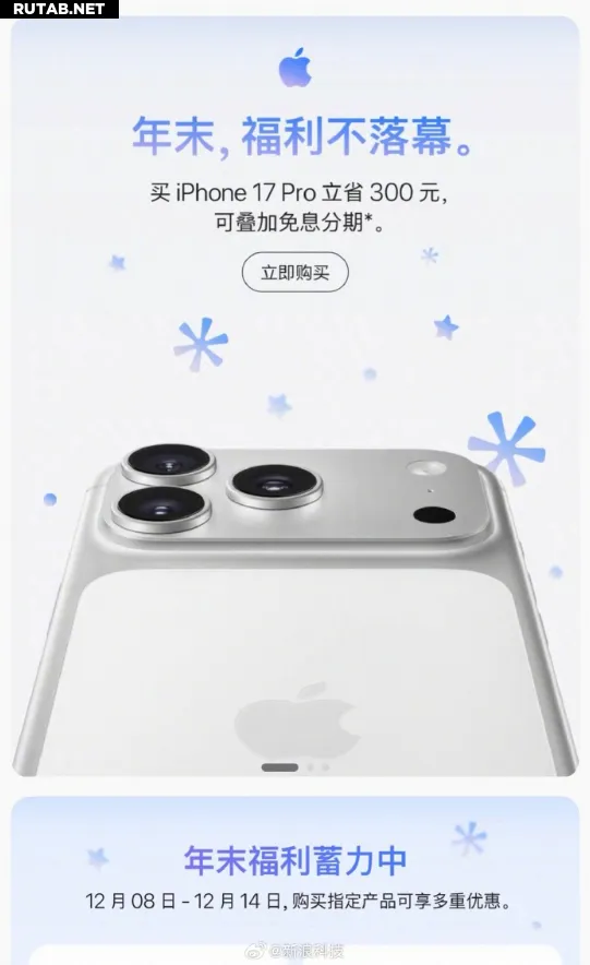 8 декабря Apple впервые официально снизила цены на флагманские iPhone 17 Pro на китайском рынке. Начальная цена iPhone 17 Pro в официальных магазинах Apple на Tmall и JD.com упала с 8999 до 8699 юаней, а Pro Max — с 9999 до 9699 юаней. Скидка в 300 юаней на обе модели действует до 14 декабря и сопровождается предложением о беспроцентной рассрочке на 12 месяцев.