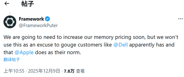 Теперь Framework публично раскритиковала ценовую политику Dell на апгрейд памяти. Например, для ноутбука Dell XPS 13 переход с 16 ГБ на 32 ГБ памяти LPDDR5X обойдётся пользователю в 550 долларов, что составляет около 3880 юаней.
