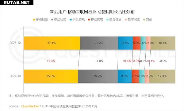 С октября 2024 по октябрь 2025 года вовлечённость поколения Z в мобильное видео продолжала расти: доля времени увеличилась с 35,8% до 37,1%.
