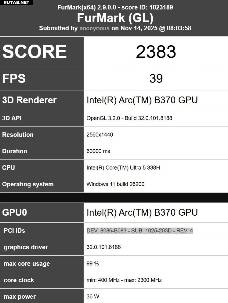 Согласно утекшим данным, Arc B370 основана на архитектуре Xe-LPG третьего поколения (Xe3), оснащена 10 графическими ядрами Xe (1280 ALU) и работает на пиковой частоте до 2300 МГц. Во время теста пиковое энергопотребление графики составило 36 Вт, а сама она используется в процессоре Core Ultra 5 338H с TDP 45 Вт.