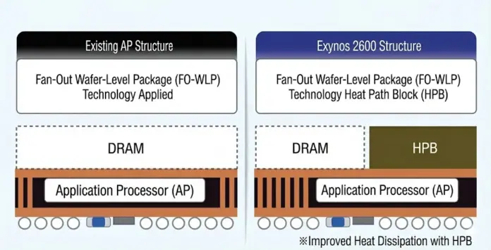 HPB представляет собой медную термопластину, которая размещается непосредственно над процессором. В предыдущих конструкциях, например, с использованием упаковки Fan-Out Wafer-Level Packaging (FOWLP), стеки памяти DRAM располагались прямо поверх процессора. Новая конструкция Exynos 2600 перемещает DRAM в сторону, освобождая место для блока HPB, который теперь имеет прямой контакт с вычислительными ядрами.