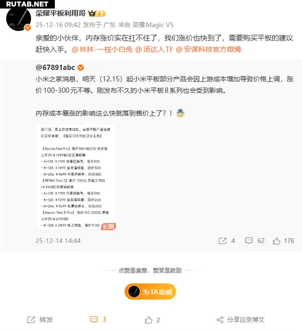 Генеральный менеджер по продуктам Honor Tablet и IoT, известный под ником «пользователь планшетов Honor», напрямую обратился к покупателям: «Цены на память растут настолько сильно, что мы больше не можем это терпеть. Скоро произойдет повышение цен, поэтому, если вам нужно купить планшет, я советую сделать это сейчас».