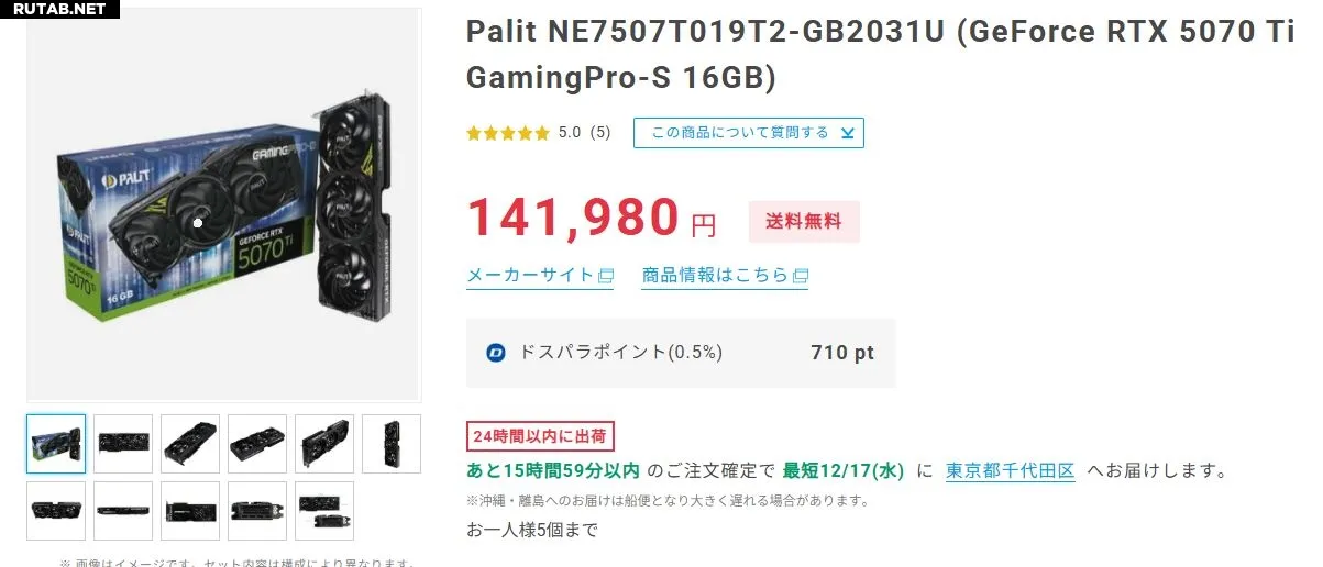 Однако после 10 декабря цена начала стремительно расти. К 15 декабря минимальная цена RTX 5070 Ti на рынке достигла 141 980 иен, увеличившись почти на 15 000 иен (около 680 юаней) менее чем за неделю.