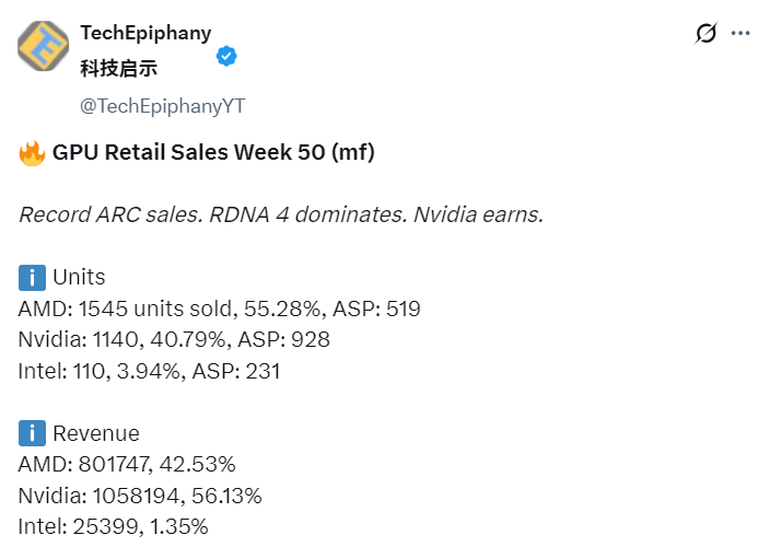 Помимо B580, модели Arc B570 и профессиональная карта Arc Pro B50 продали по 20 экземпляров, что сравнимо с результатом RX 9070. На начальном уровне видеокарта Arc A310 также показала хорошее признание рынка, продав около 30 штук.