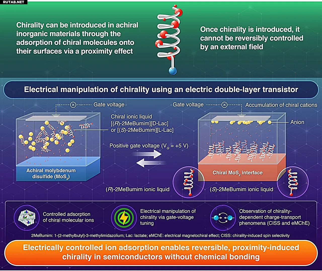 Новый подход, опубликованный в Science Advances, позволяет управлять «рукостью» материала с помощью электричества. Учёные использовали транзистор с двойным электрическим слоем (EDLT), заполненный хиральной ионной жидкостью, чтобы наложить специфическую хиральность на ахиральную поверхность дисульфида молибдена (MoS₂).