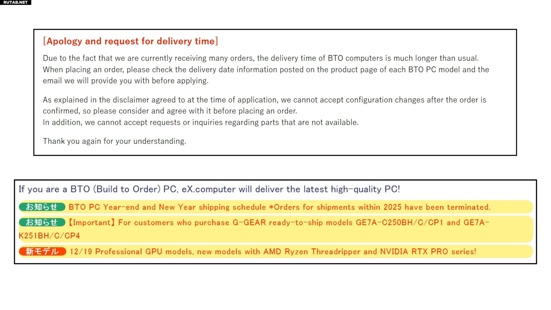 Знаменитая сеть TSUKUMO, под брендами G-Gear и eX.computer, полностью прекратила принимать новые заказы на сборные системы. Магазин также приостановил оформление заказов с доставкой до конца 2025 года.