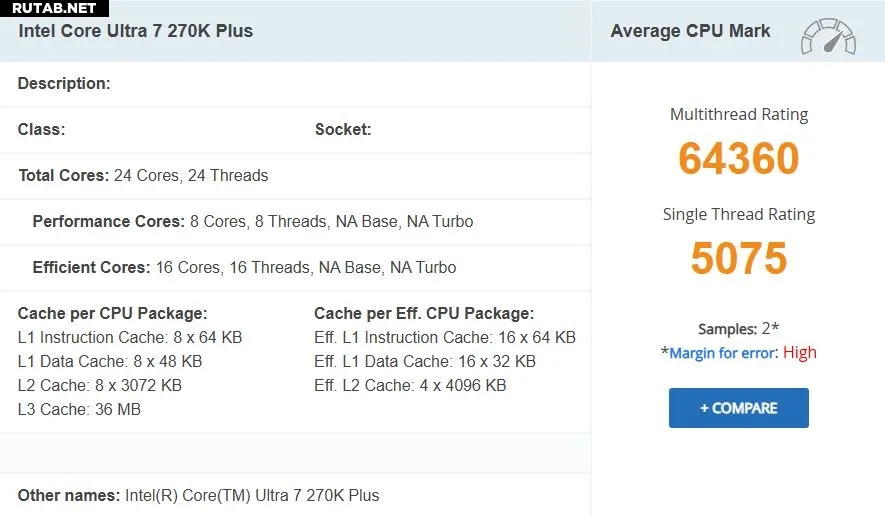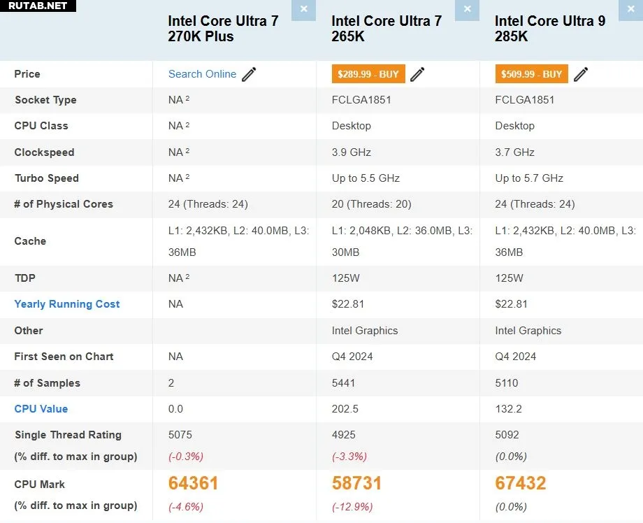 В базе данных бенчмарка PassMark появилась информация о процессоре Intel Core Ultra 7 270K Plus, который относится к предстоящему семейству Arrow Lake Refresh. Согласно данным, его производительность уже сравнялась с показателями нынешнего флагмана — Core Ultra 9 285K.