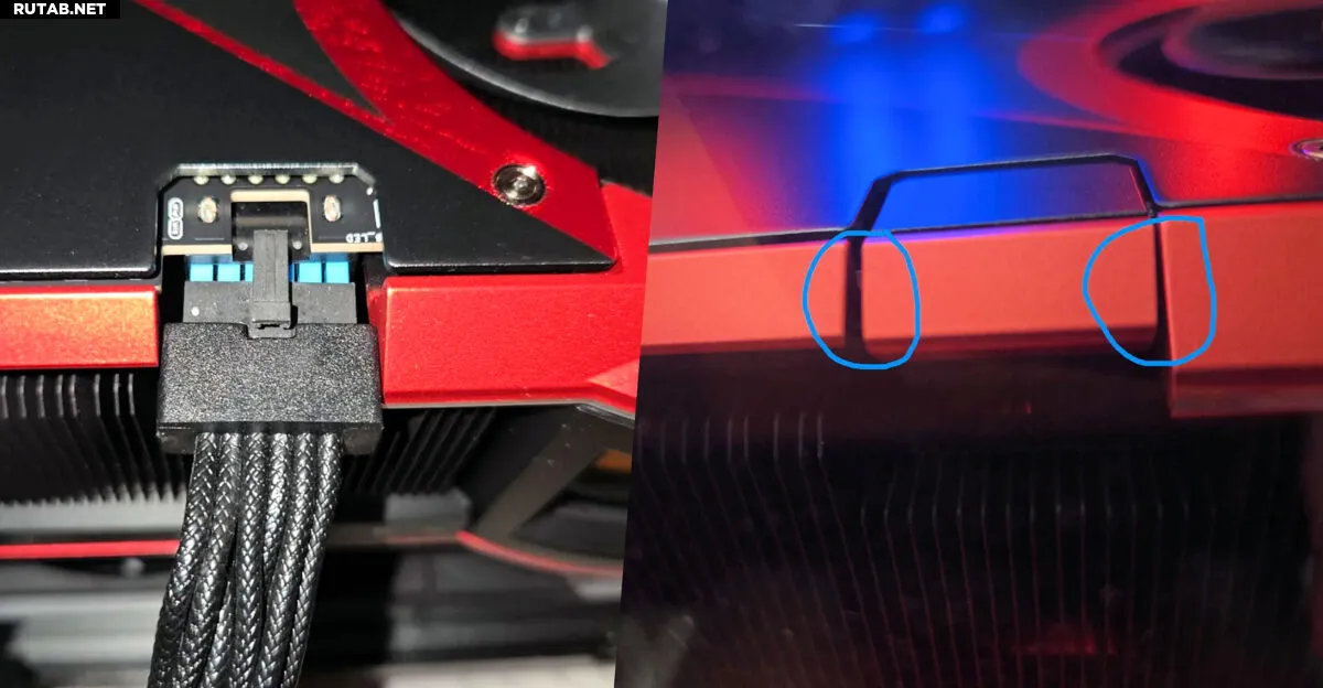 На опубликованных пользователем фотографиях отчетливо видно, что 12V-2x6 разъем питания на этой видеокарте не выровнен по центру отверстия в кожухе системы охлаждения, а заметно смещен в сторону рамки кожуха.