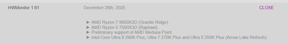 HWMonitor обновился: теперь поддерживает Ryzen 7 9850X3D и Arrow Lake Refresh