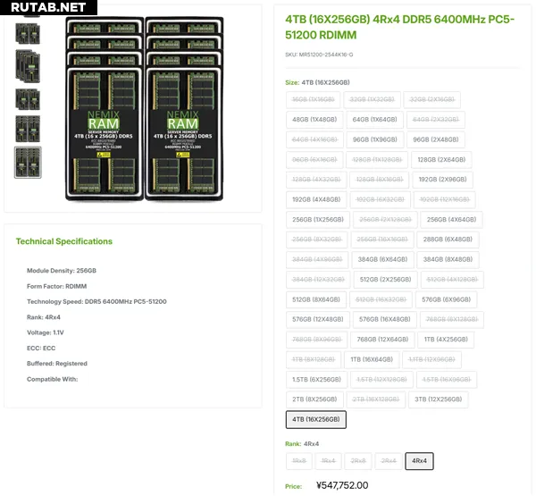 Компания Nemix RAM, специализирующаяся на поставках памяти, предлагает на продажу топовый комплект оперативной памяти DDR5 объёмом 4 ТБ, разработанный для крупных серверов.