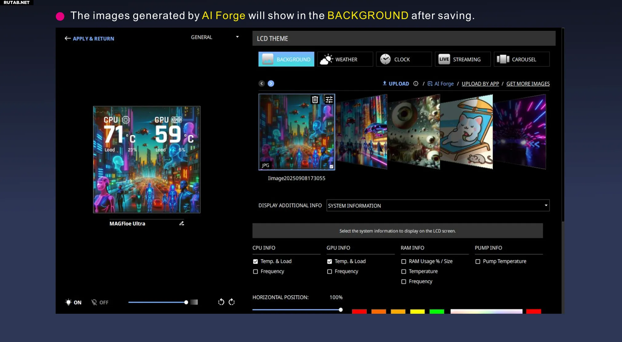 Кулер оснащён 6,67-дюймовым изогнутым AMOLED-дисплеем с разрешением 2240 x 1080 пикселей, который охватывает блок помпы. Для настройки изображения на экране необходимо использовать фирменное ПО TT RGB PLUS 3.0, где и находится опция AI Forge.