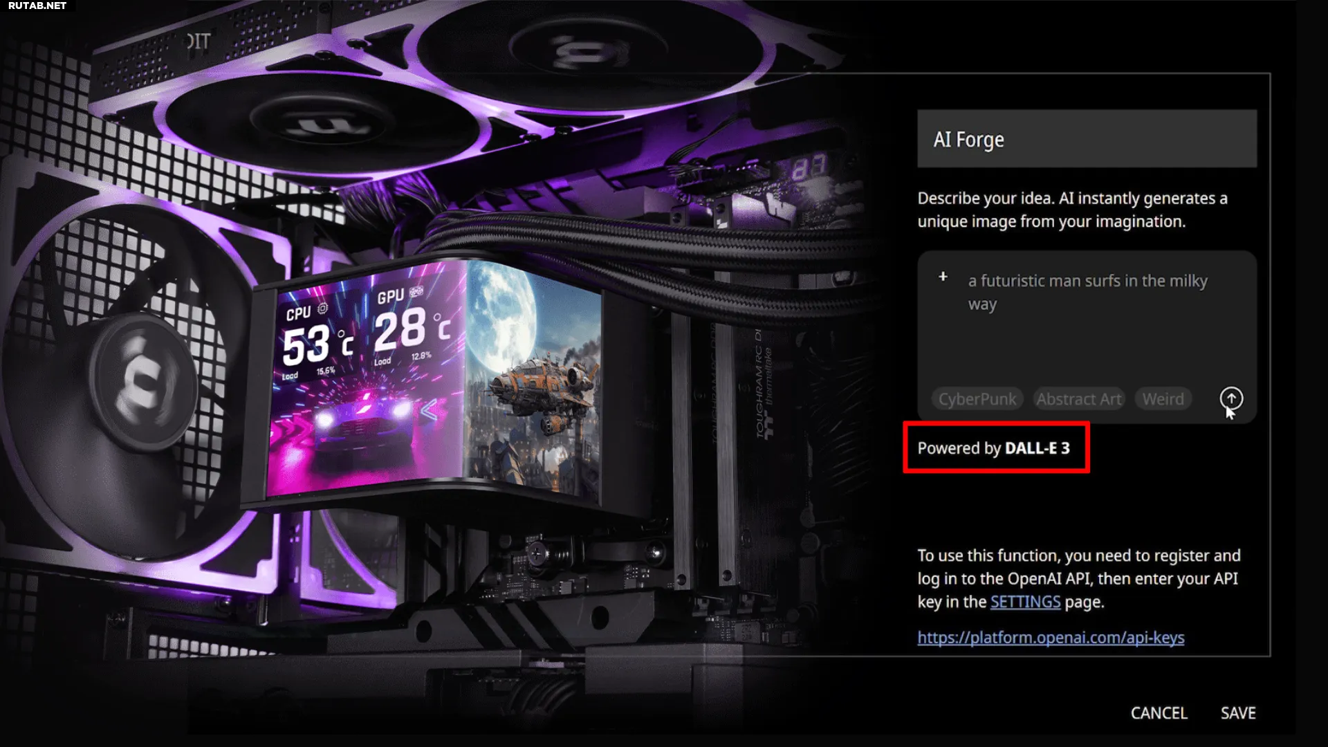 Функция предлагает на выбор две модели для генерации изображений: OpenAI Dall-E 3 и китайский сервис JiMeng. Для использования Dall-E 3 пользователю необходим платный аккаунт OpenAI (отдельный от ChatGPT) и API-ключ. Согласно расценкам OpenAI, создание одного изображения по запросу обойдётся примерно в $0,04 (~3 рубля). Thermaltake отмечает, что новым пользователям OpenAI потребуется пополнить баланс минимум на $5 (~400 рублей), чего хватит на создание до 125 изображений.