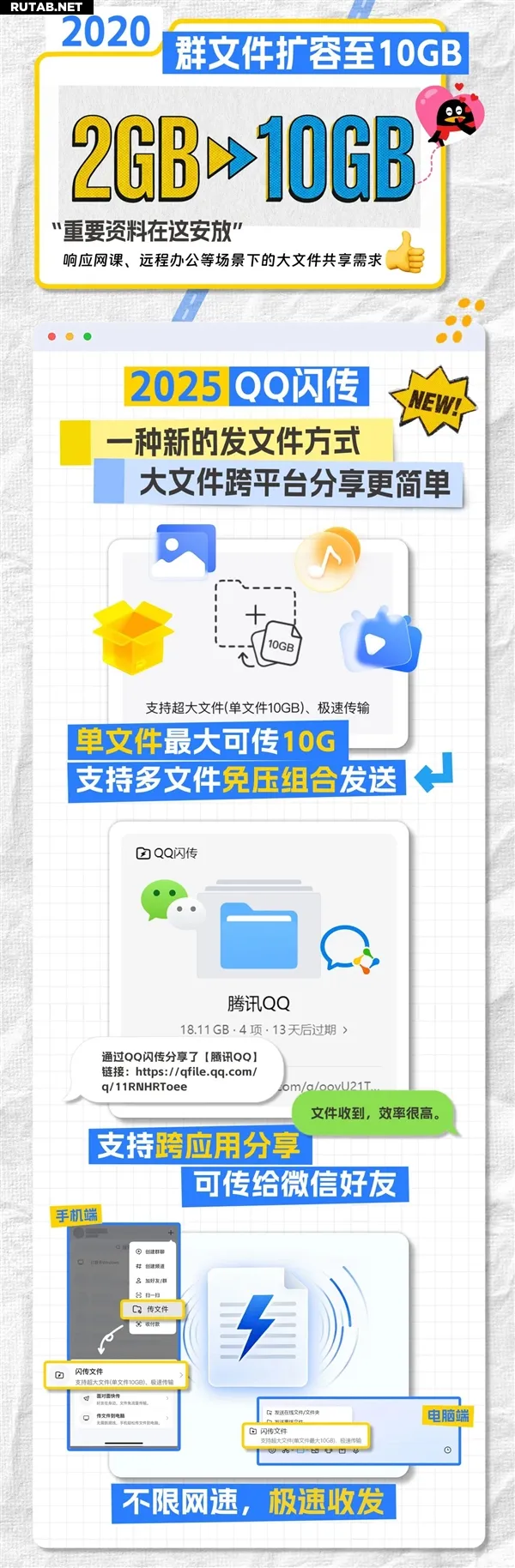 2025 год: поддержка «Мгновенной передачи» в QQ, сверхбыстрая отправка и получение, максимальный размер одного файла — 10 ГБ, возможность отправки нескольких файлов без упаковки в архив, а также кроссплатформенный обмен, включая отправку контактам в WeChat.
