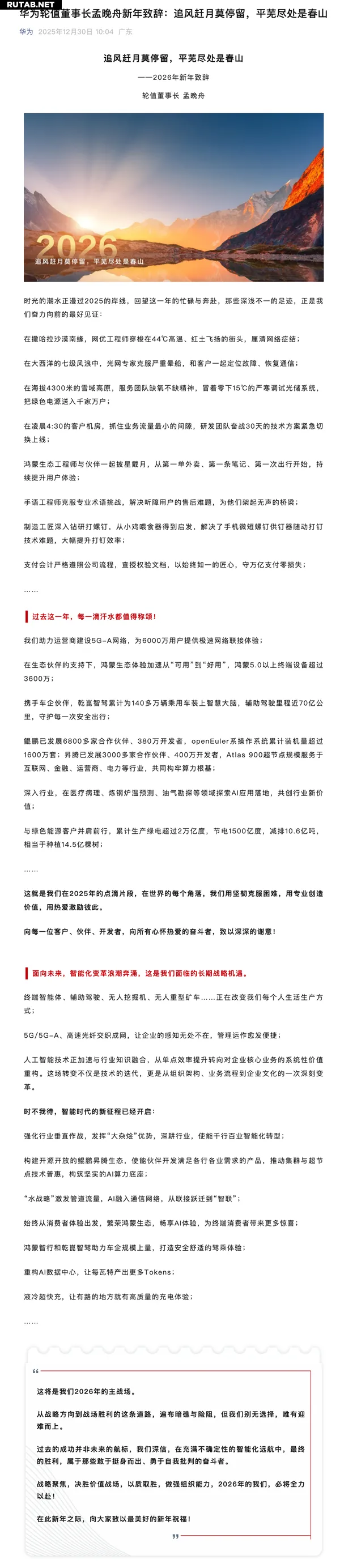 Компания Huawei опубликовала новогоднее обращение, в котором подвела итоги 2025 года и обозначила ключевые достижения в развитии своих технологий.