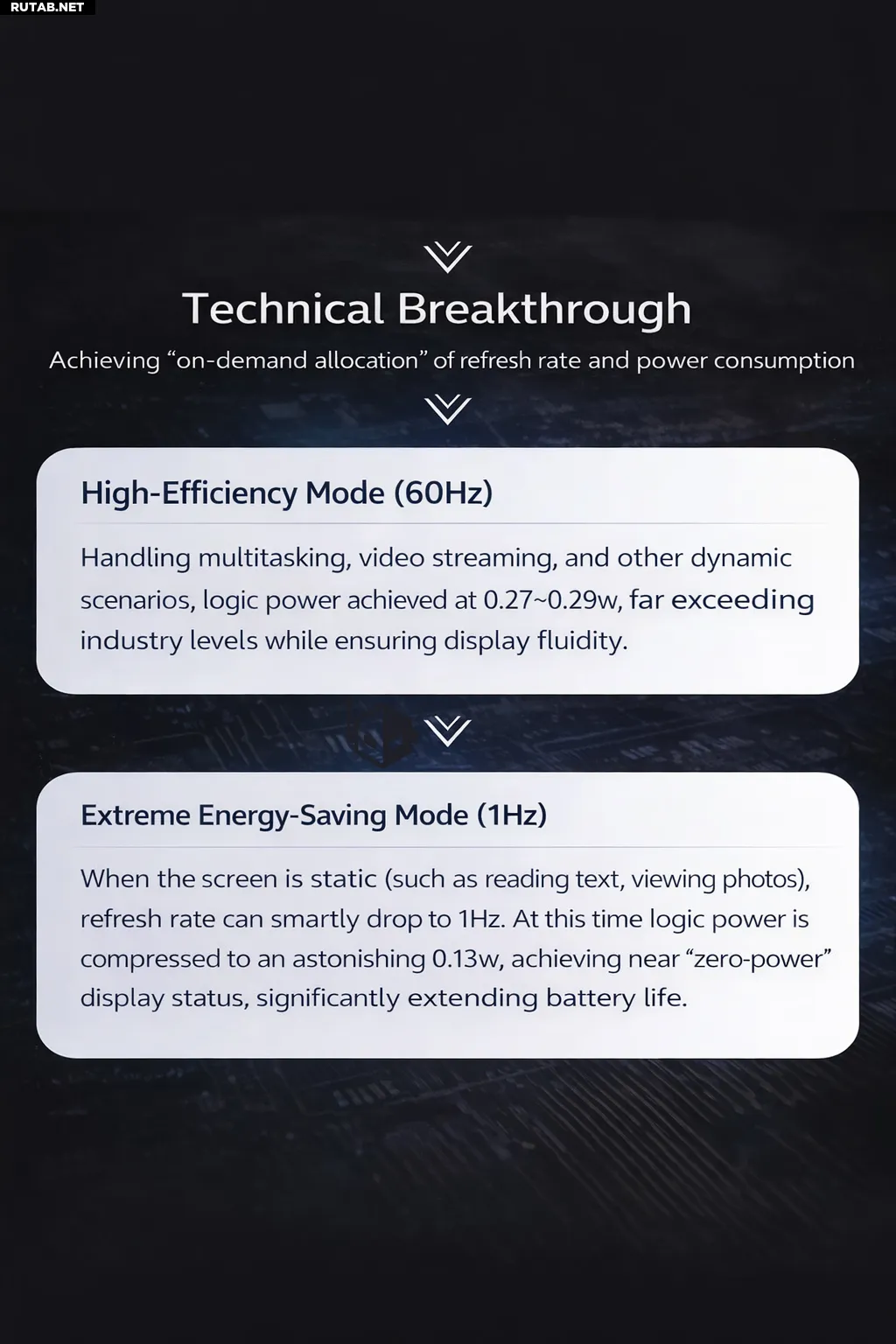 В стандартном режиме 60 Гц экран потребляет всего 0,27-0,29 Вт, что уже само по себе впечатляющий результат. Однако настоящая магия происходит в «Экстремальном режиме экономии энергии». Когда на экране отображается статичный контент (например, мы читаем документ или просматриваем фото), частота обновления падает до 1 Гц, а потребление энергии снижается до уровня 0,13 Вт. Это доли ватта, которые в масштабах всего рабочего дня могут превратиться в драгоценные часы работы ноутбука.