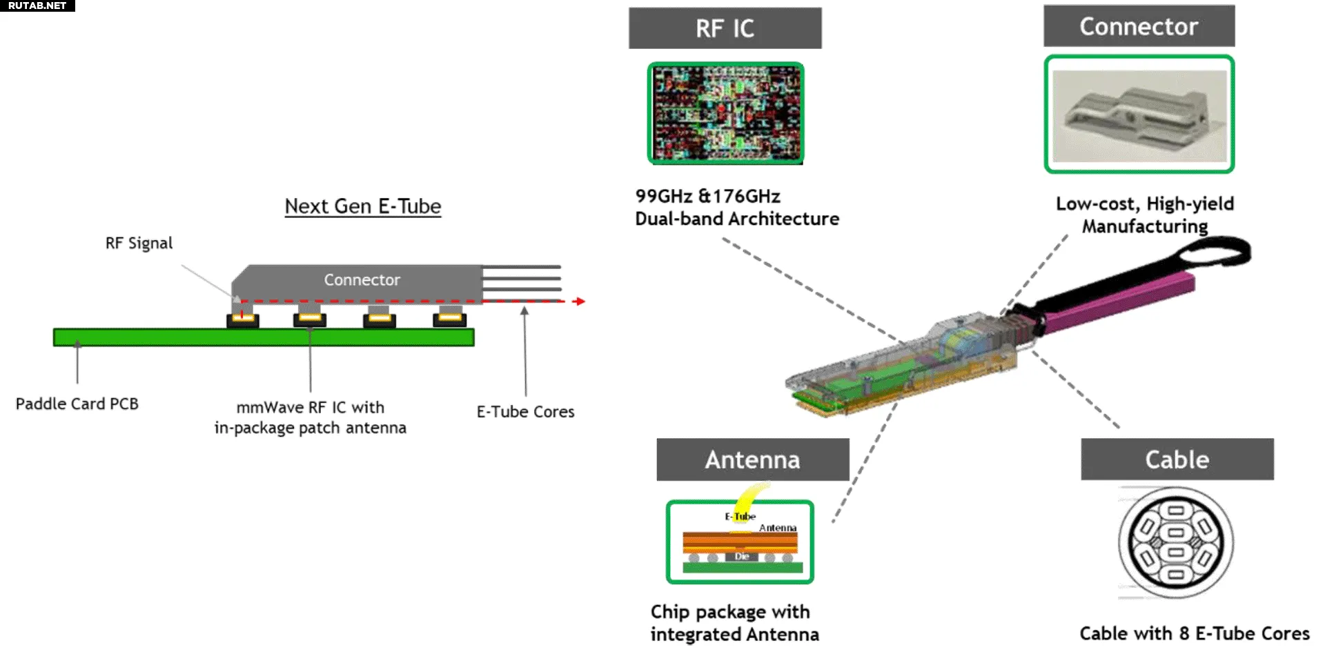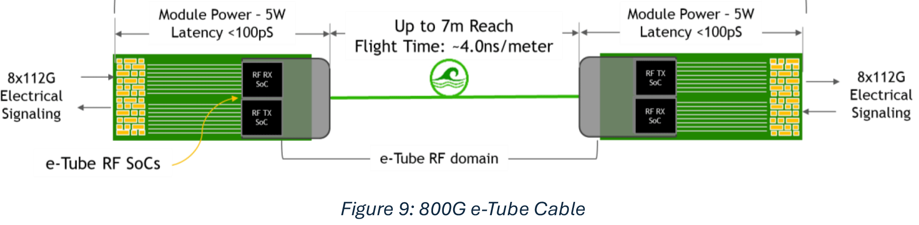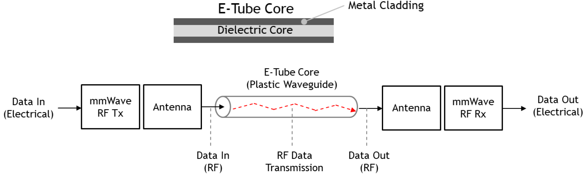 Реализация компании Point2 использует так называемый «активный радиокабель», состоящий из восьми волноводов «e-Tube». Каждый волновод передаёт данные на двух частотах — 90 ГГц и 225 ГГц, а подключаемые модули на обоих концах преобразуют цифровые сигналы непосредственно в модулированные миллиметровые радиоволны и обратно. Полный кабель обеспечивает пропускную способность 1,6 Тбит/с, имеет диаметр 8,1 мм (примерно вдвое меньше по объёму, чем сопоставимый активный медный кабель) и может достигать длины до семи метров, что более чем достаточно для соединений внутри стойки. В Point2 заявляют, что их конструкция потребляет примерно в три раза меньше энергии, чем оптические линии, стоит примерно на треть дешевле и добавляет задержку, составляющую всего одну тысячную от оптической.