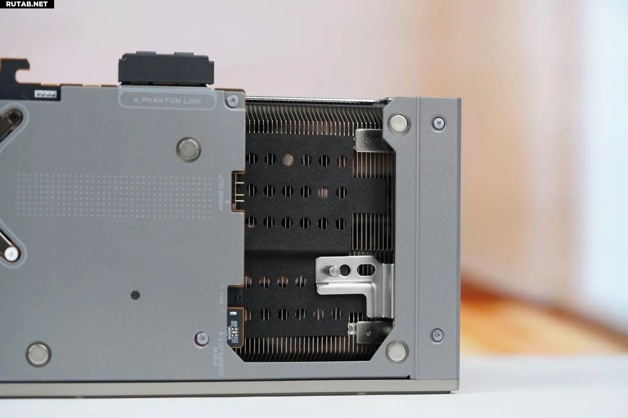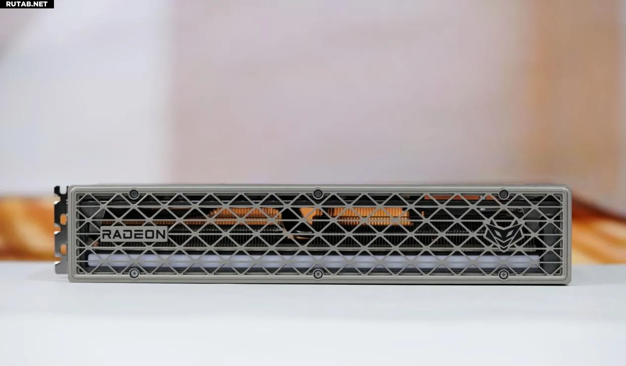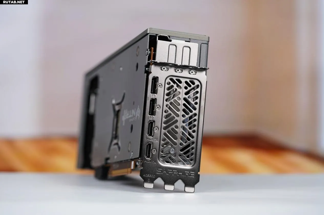 На всей карте выполнено множество перфораций, а на лицевой стороне — крупная сетчатая панель. Настраиваемая решётка в верхней части карты и большие вентиляционные отверстия позволяют увидеть внутренние рёбра радиатора и уникальную RGB-подсветку Sapphire «Dynamic Island».