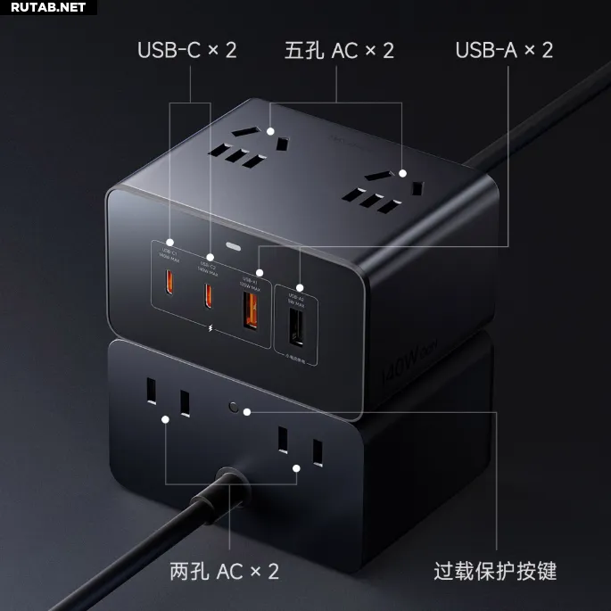 Зарядная станция задумана как централизованное решение для питания устройств на современном рабочем столе. Она объединяет высокоскоростную зарядку по USB и традиционные розетки в одном компактном блоке. Устройство оснащено двумя портами USB-C, двумя портами USB-A и четырьмя розетками переменного тока, что позволяет одновременно питать различные гаджеты.