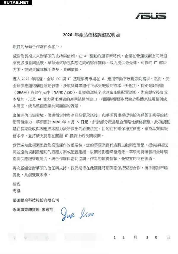 В официальном уведомлении ASUS сообщает, что решение связано с глобальными структурными колебаниями в цепочках поставок. Множество ключевых компонентов, особенно память и накопители, испытывают серьёзное давление из-за роста себестоимости.