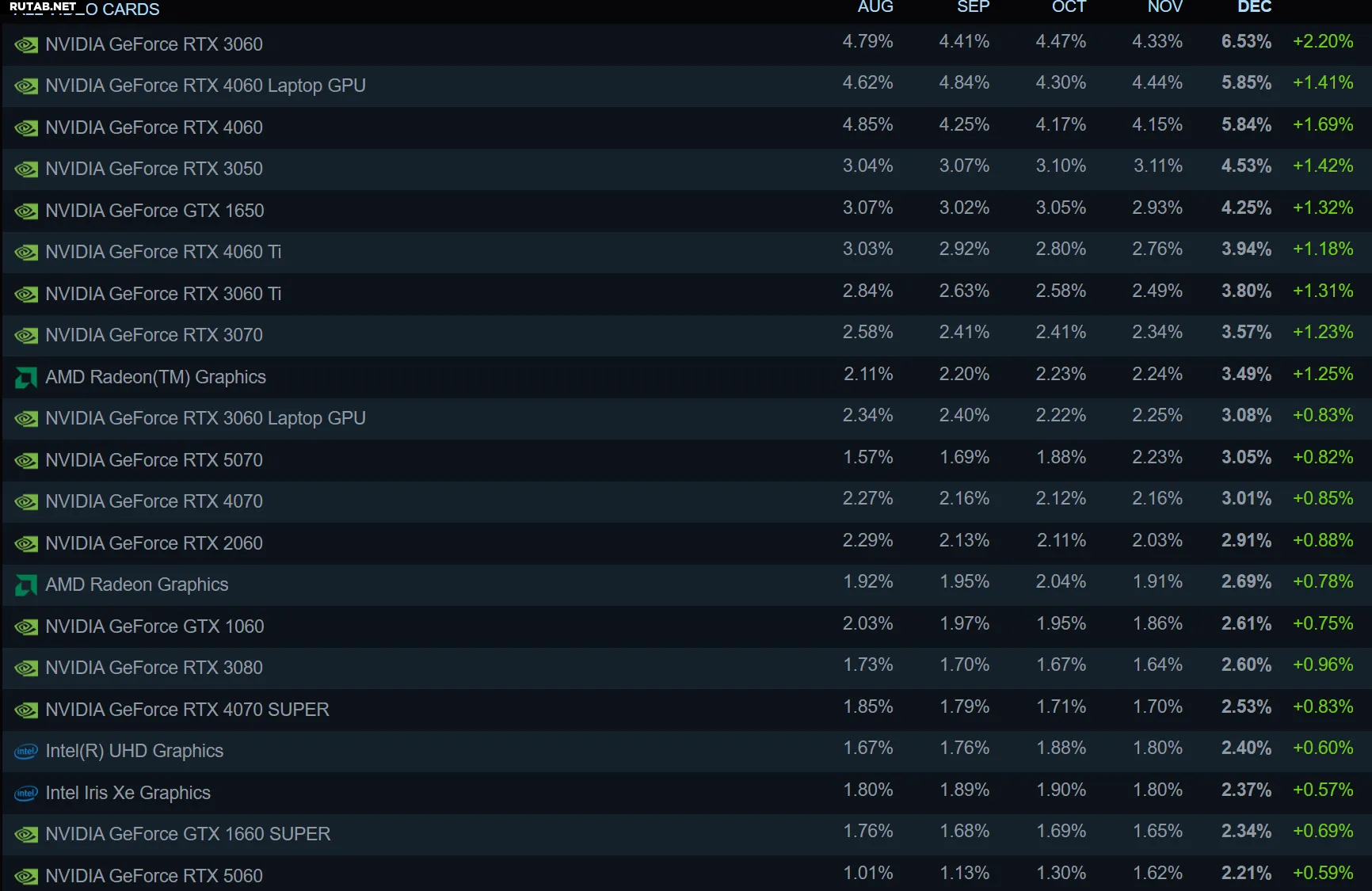 Главной сенсацией нового отчёта стало первое официальное появление видеокарты Radeon RX 9070 в списке самых популярных GPU. После нескольких месяцев присутствия на рынку, новейший представитель семейства RDNA 4 преодолел статистический порог с долей в 0,22%. Хотя это скромный дебют, стоит отметить, что многие карты серии RX 9000 всё ещё фигурируют в отчёте под загадочным названием «Radeon Graphics», что говорит о том, что их реальная популярность может быть выше.