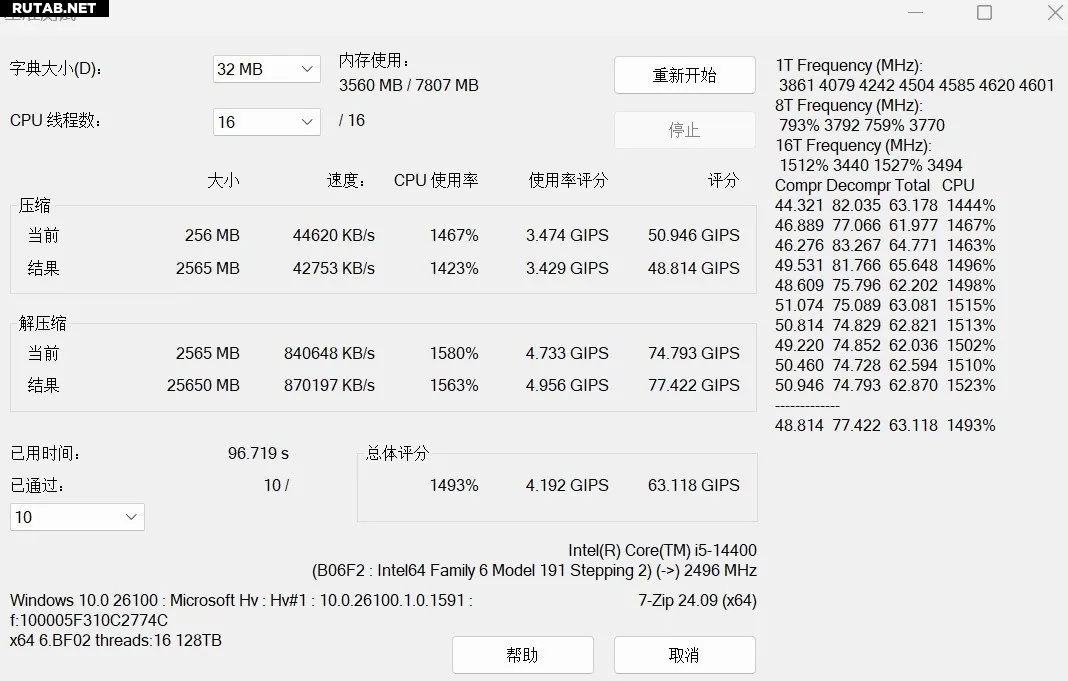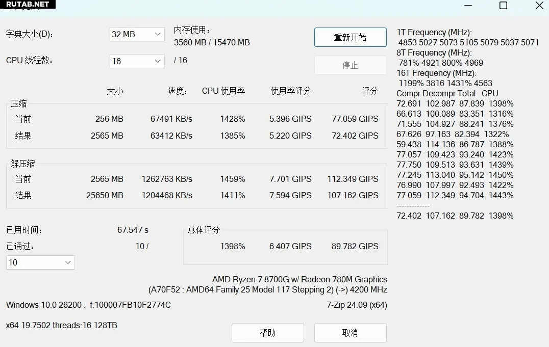 В тестах, связанных с работой памяти и архивацией, Ryzen 7 8700G также продемонстрировал преимущество. Его задержка памяти в AIDA64 составила 87,3 нс против 107,9 нс у конкурента. В бенчмарке 7-Zip общий результат AMD-процессора составил 89,782 GIPS против 63,118 GIPS у Intel.
