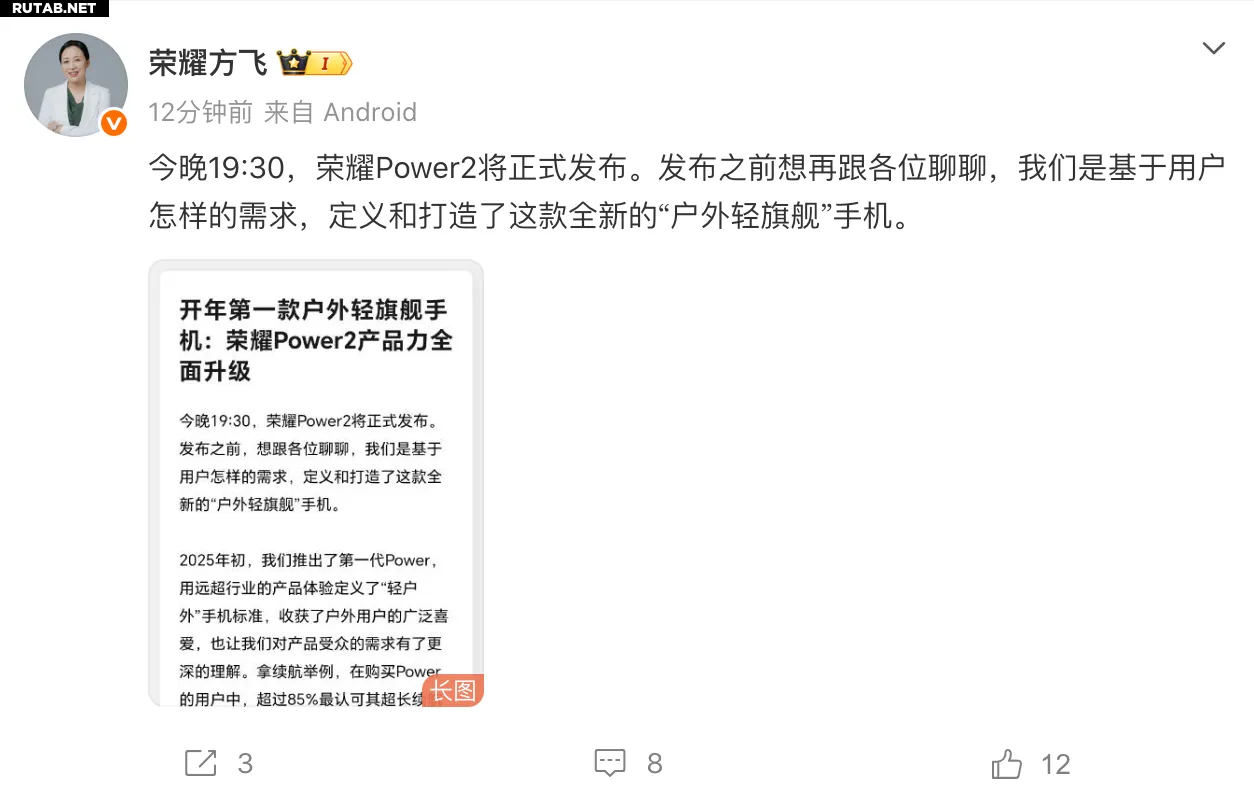 Сегодня, 5 января, в 14:30 по московскому времени состоится презентация нового смартфона Honor Power2. Президент продуктовой линейки Honor Фан Фэй (方飞) опубликовала в Weibo пост, обозначив позиционирование новинки и уверенно продемонстрировав топовые характеристики этого «легкого флагмана для активного отдыха». Ключевые преимущества устройства напрямую нацелены на долгое время игнорировавшуюся рынком аудиторию — людей, работающих на открытом воздухе.