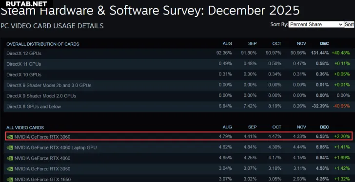 Чтобы обеспечить партнёров доступными решениями для массового рынка, NVIDIA возвращает в строй проверенную модель из серии «60». RTX 3060 была представлена в 2021 году и официально снята с производства в 2024-м. Несмотря на это, её популярность остаётся феноменальной: по данным последней статистики Steam, RTX 3060 с долей в 6,53% продолжает удерживать первое место в рейтинге самых популярных видеокарт среди геймеров.