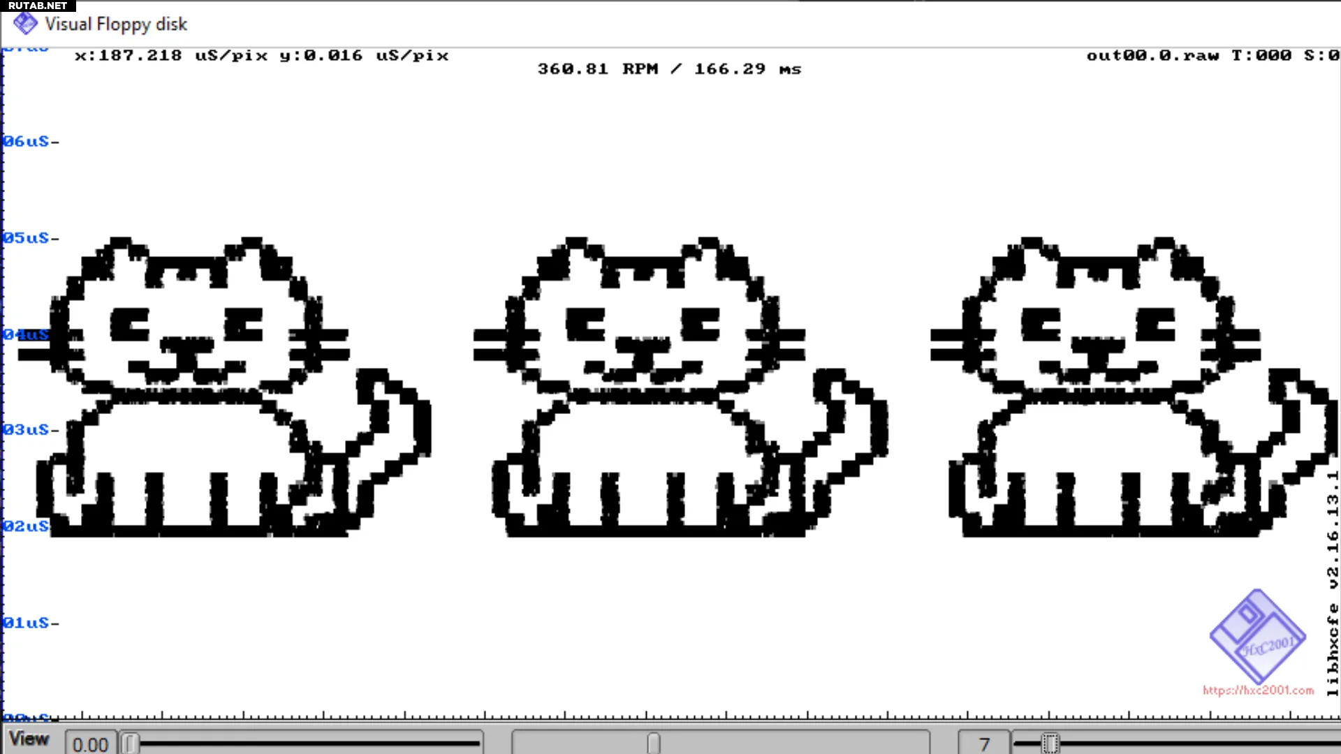Несмотря на то, что гибкие диски давно вытеснены флеш-памятью и SSD, хакер под ником dbalsom нашёл им творческое применение. Инструмент pbm2track манипулирует магнитными импульсами на диске, выстраивая их таким образом, чтобы при визуализации временной диаграммы они формировали чёрно-белое изображение.