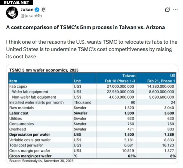 Валовая прибыль от выпуска 5-нм чипов на американском заводе TSMC упала с 62% (на Тайване) до 8%, что составляет снижение почти на 87%.