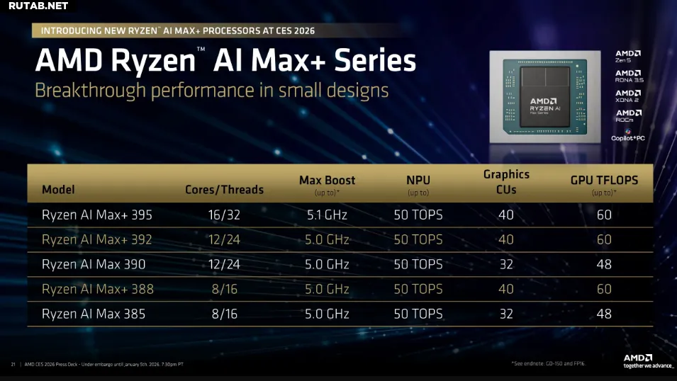 Новинками стали Ryzen AI Max+ 392 и Ryzen AI Max+ 388. Оба процессора основаны на существующих моделях, но получили серьёзное обновление графики. AMD оснастила их встроенным GPU на RDNA 3.5 с 40 вычислительными блоками (CU), который, по заявлению компании, способен обеспечить до 60 терафлопс вычислительной мощности.