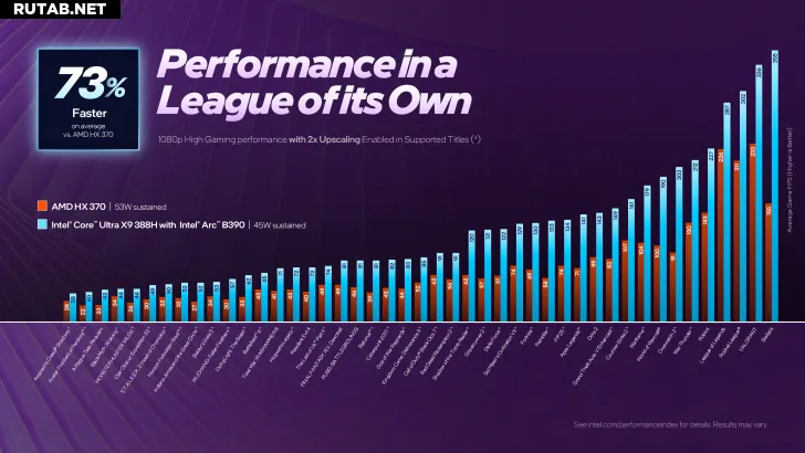 Что касается нативной производительности, то Core Ultra X9 388H с графикой B390 при потреблении 45 Вт оказывается на 82% быстрее 53-ваттного AMD Radeon 890M и превосходит графику Adreno в Qualcomm Snapdragon X Elite в 2.6 раза.