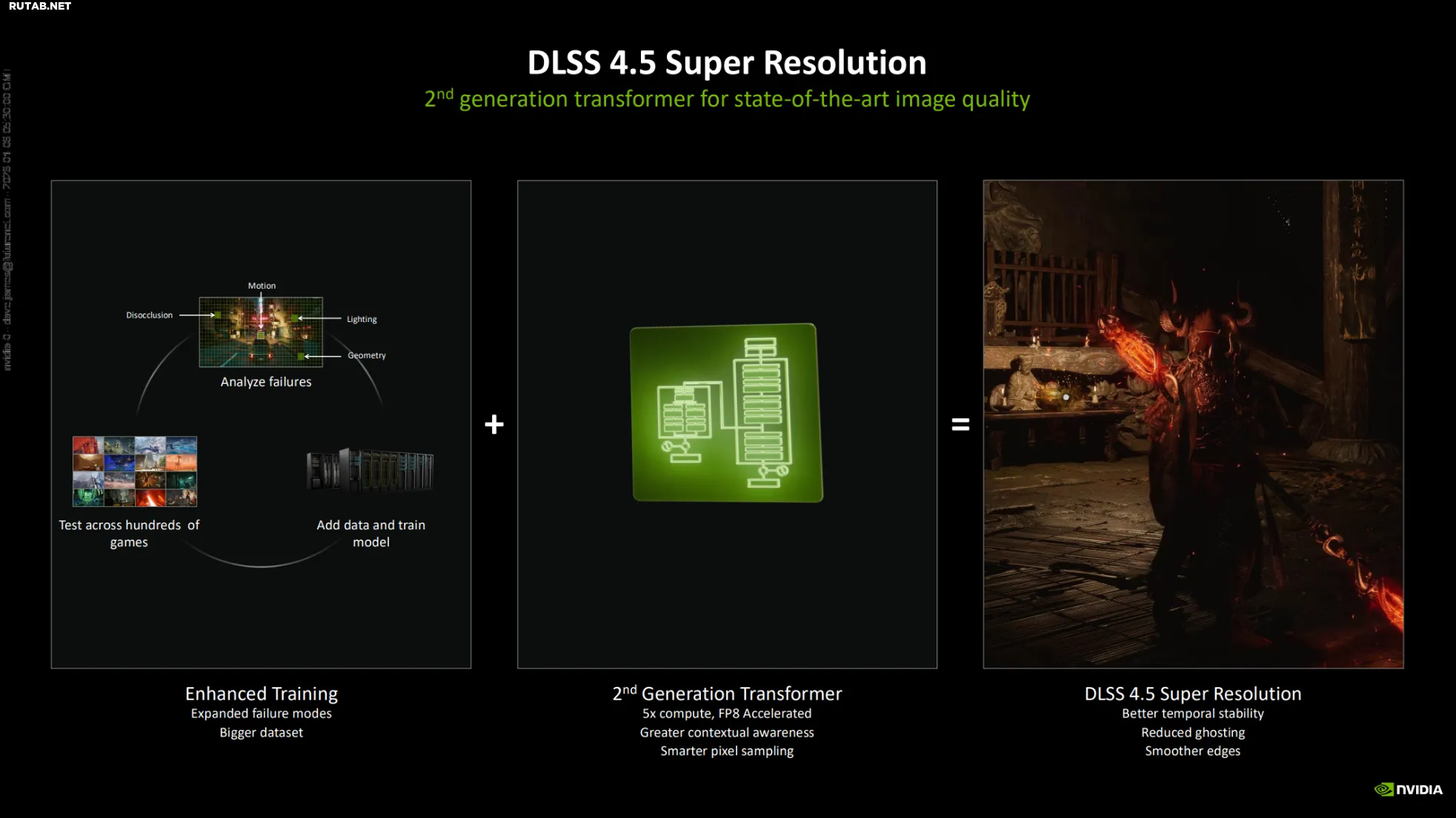 Для достижения такого результата компания использует модель искусственного интеллекта второго поколения на основе трансформеров. По словам Nvidia, новая модель обеспечивает лучшую временную стабильность, уменьшает эффект ореолов и сглаживает края объектов, что должно решить проблемы с визуальными артефактами, характерные для генерации кадров.