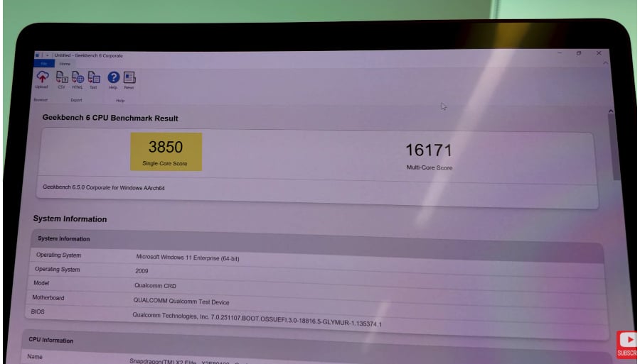 12-ядерный Snapdragon X2 Elite (X2E-80-100) в паре с 32 ГБ памяти и 1 ТБ накопителя набрал 3850 баллов в одноядерном и 16171 балл в многоядерном тесте Geekbench. Для сравнения, 10-ядерный Apple M4 в MacBook Air набирает около 3839 баллов в одноядерном и 14861 в многоядерном тесте.