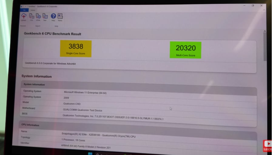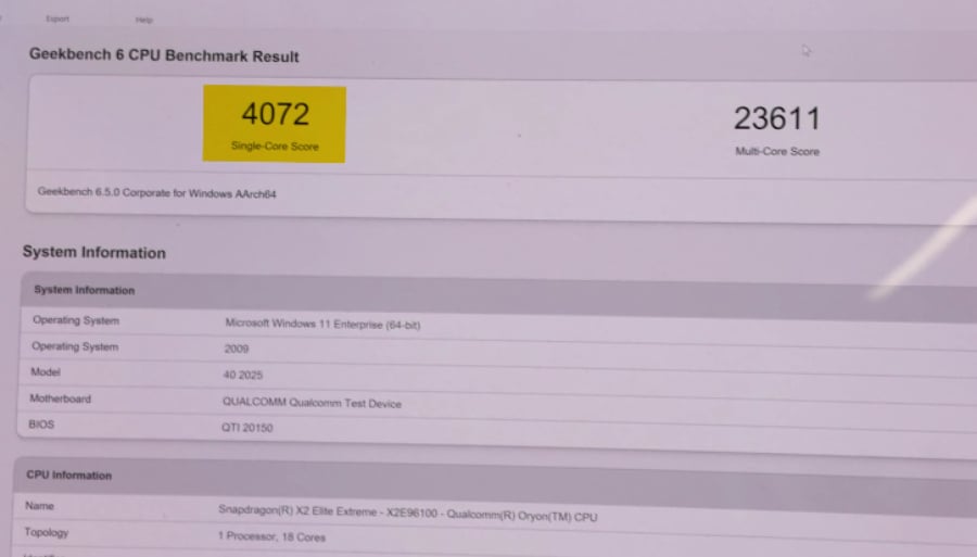 18-ядерный Snapdragon X2 Elite (X2E-88-100) показал результат 3838 баллов в одноядерном тесте и значительно более высокий — 20320 — в многоядерном. Эти цифры ставят его в один ряд с чипами Apple M4 Pro.