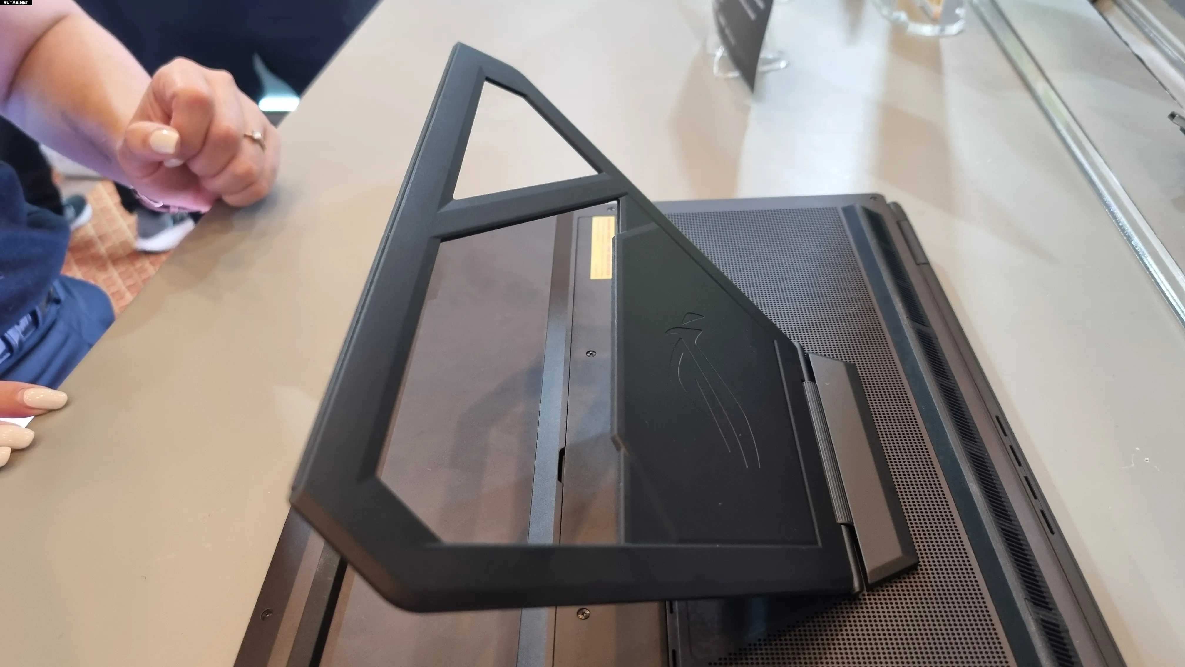 Устройство представляет собой два дисплея с разрешением 3K и частотой 120 Гц, соединённых шарниром посередине, как гигантская книга. В нижней части расположена основная начинка, включая топовые компоненты: мобильную видеокарту GeForce RTX 5090 и процессор Intel Core Ultra 9 386H. Для устойчивости в сложенном положении ноутбук имеет металлическую подставку.
